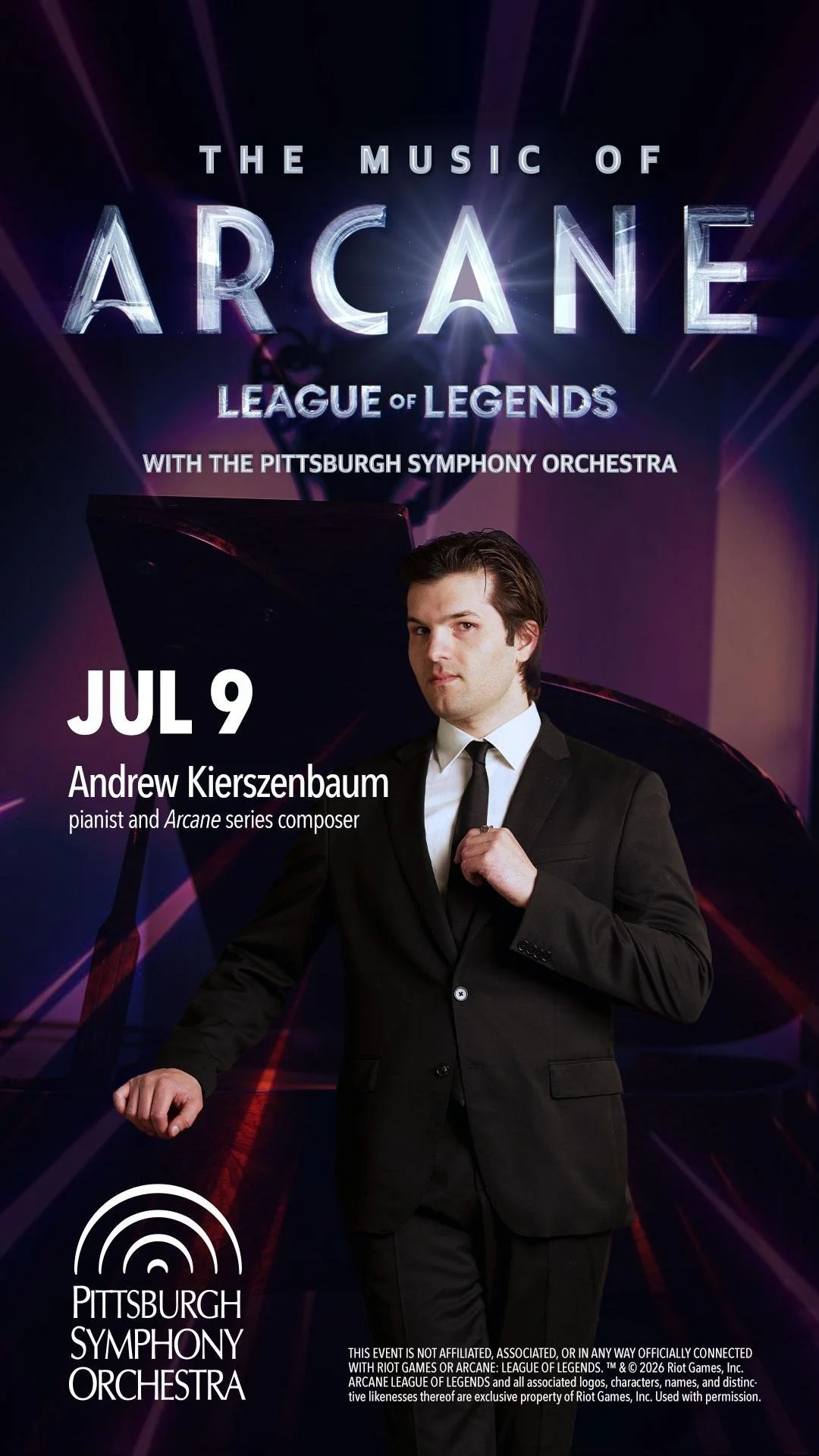 On July 9, 2026, Arcane series composer and pianist Andrew Kierszenbaum will present and perform music from the score of Netflix and Riot Games’ 8x Emmy-winning original show, with the Grammy-winning Pittsburgh Symphony Orchestra.